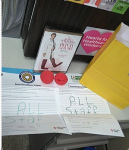 When it came time for discharge, Tina knew she wanted to do something to express her appreciation to this team that had become like family during her time at the hospital. She asked her husband to bring in a clown costume, some red noses and several copies of “Patch Adams,” a 1998 movie about a real-life doctor played by Robin Williams who loved to make his patients laugh.